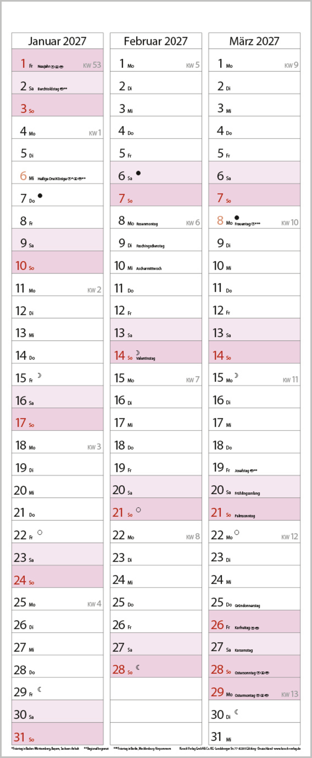 Weitere Informationen wie Mondphasen, Ferientermine und Feiertage (auch regionale) sowie deutlich lesbare Kalenderwochen runden den Kalender ab und sorgen für einen vollständigen Überblick Ihres Jahres.