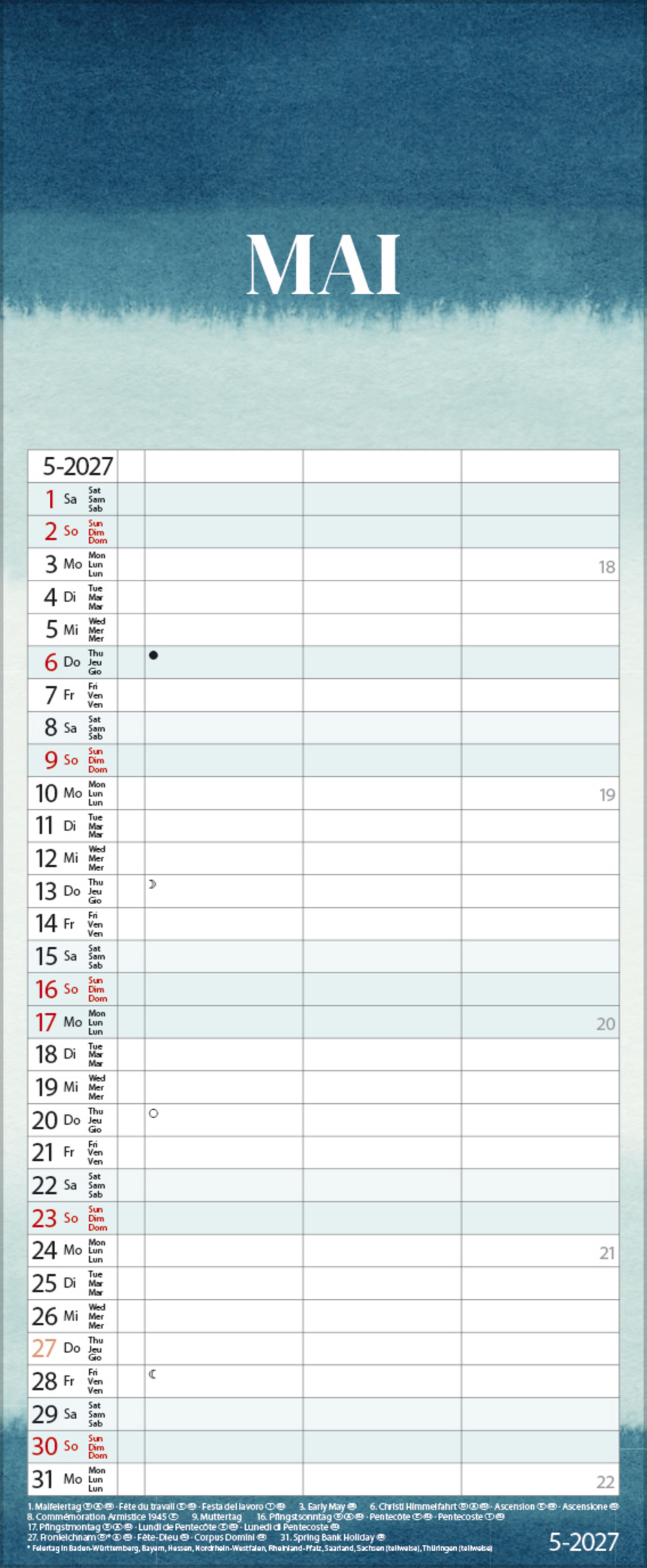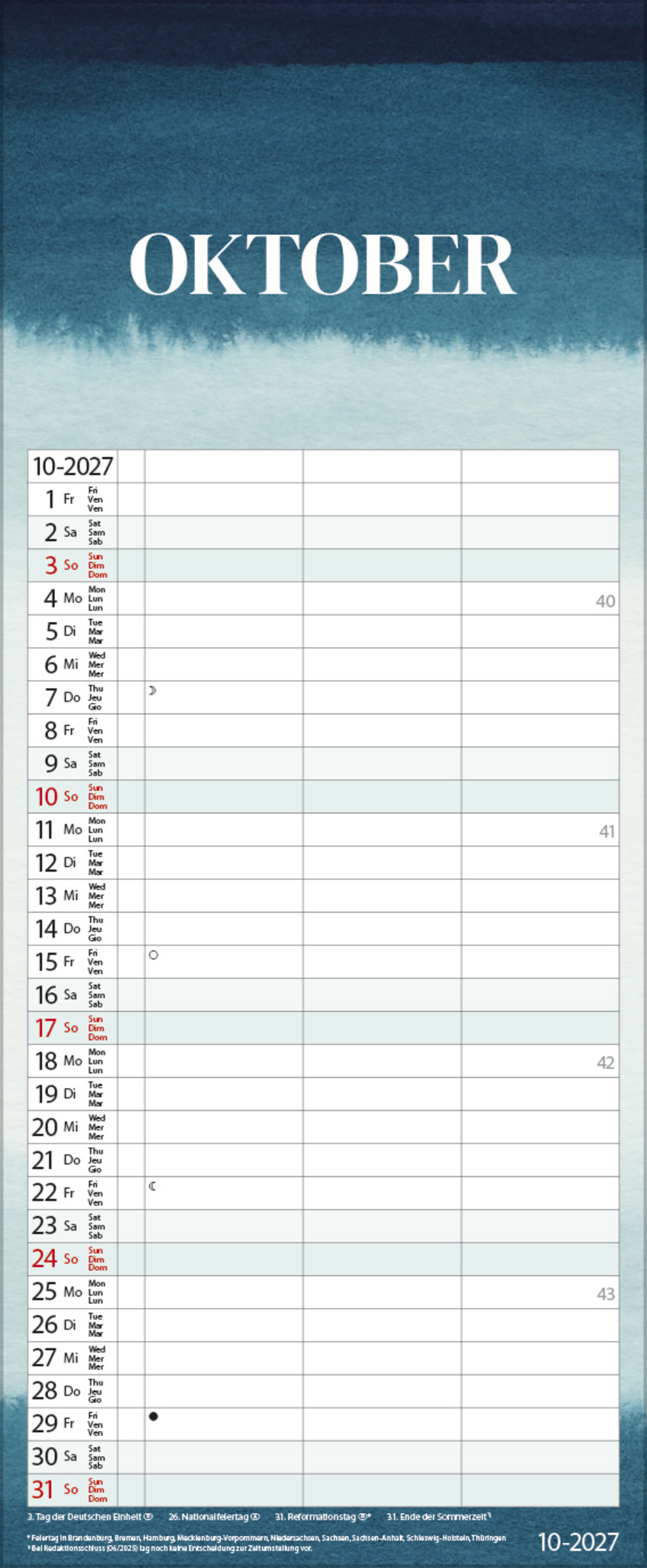 Zarte Aquarellverläufe und kraftvolle Typografie treffen in diesem modernen Timer for 2 aufeinander. Mit 3 Spalten für viel Platz zum Planen, einer übersicht der Ferientermine und einer Vorschau bis März des Folgejahres.
