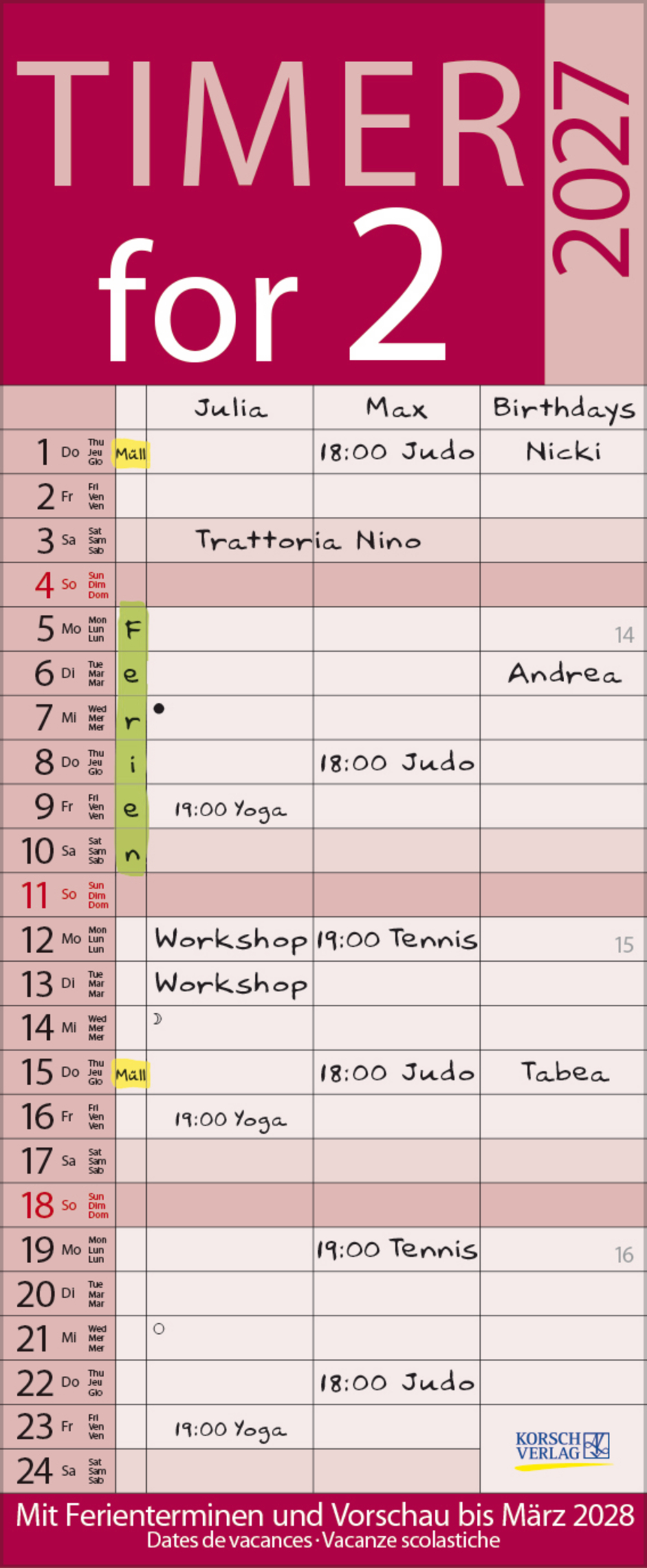 Dieser Wandkalender hilft Ihnen dabei alle wichtigen Termine stets im Blick zu haben. Mit drei Spalten zum Eintragen von Geburtstagen, Terminen und Erinnerungen bietet dieser Jahreskalender viel Platz für Notizen. Dadurch ist es auch möglich mehrere Termine in einen Tag zu schreiben. Er eignet sich perfekt für die Organisation des Ehe- oder Familienlebens. Neben dem gesamten Kalenderjahr enthält der Wandplaner auch eine Vorschaubis März des Folgejahres.