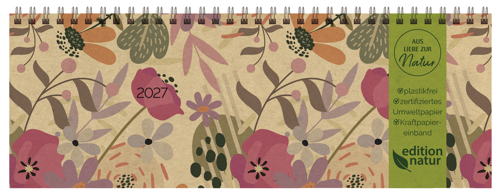 Nachhaltiger Tischquerkalender mit umweltfreundlichem, farbig bedrucktem Kraftpapier-Einband in angesagtem Dschungel-Design. Der Umschlag punktet mit seiner natürlichen Haptik. Spiralbindung. 128 Seiten. Pro Woche zwei Seiten.