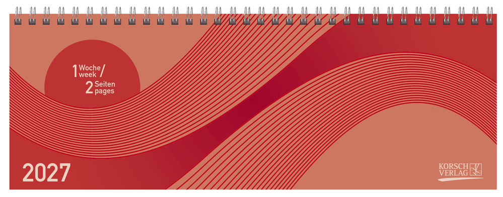 Praktischer Tischquerkalender. Cover rot. Spiralbindung. 128 Seiten. Pro Woche 1 Doppelseite. Kalendarium d-e-f-i.