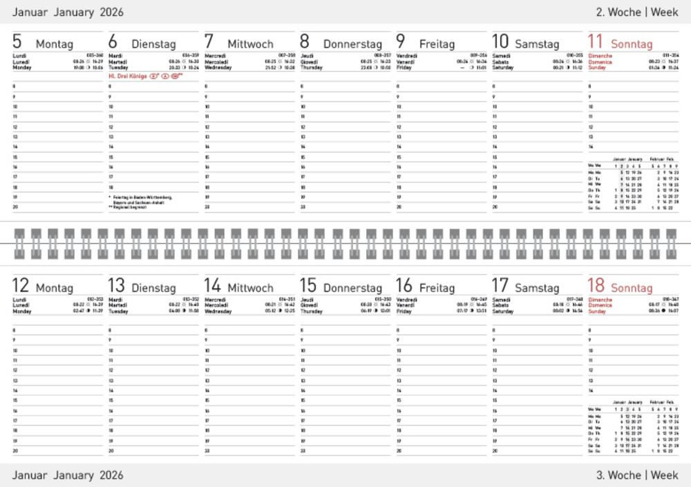 - Tischkalender im Quer-Format: 29,8 x 10,5 cm; Farblich hervorgehobene Feiertage