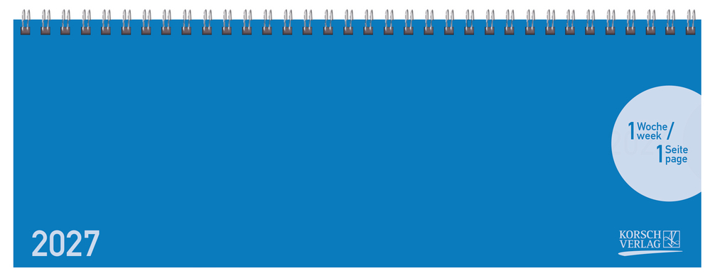 Praktischer Tischquerkalender. Cover blau. Spiralbindung. 64 Seiten. Pro Woche 1 Seite. Kalendarium d-e-f-i.