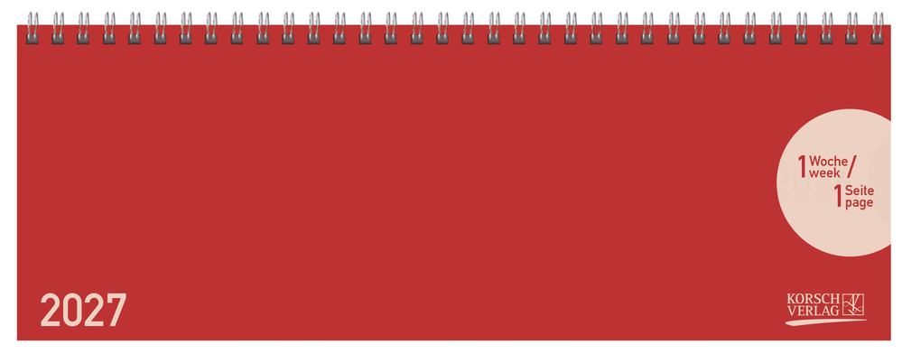 Praktischer Tischquerkalender. Cover rot. Spiralbindung. 64 Seiten. Pro Woche 1 Seite. Kalendarium d-e-f-i.