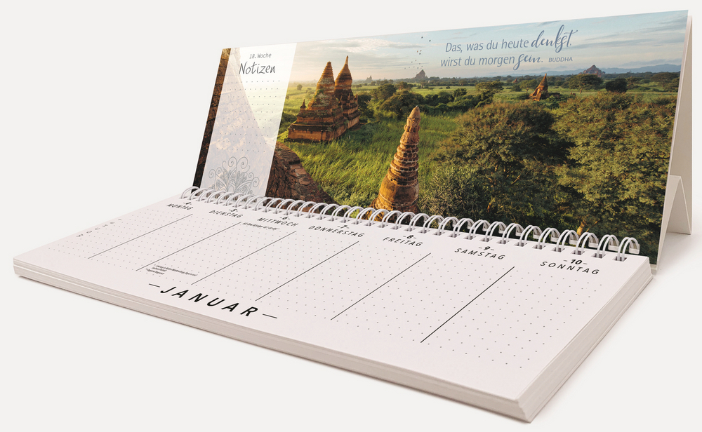 - Jede Woche auf einer Doppelseite mit Platz für Notizen und spontane Ideen