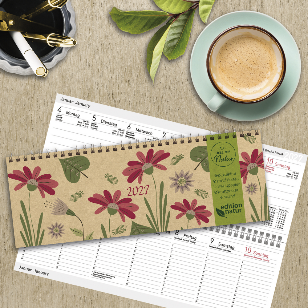 Nachhaltiger Tischquerkalender mit umweltfreundlichem, farbig bedrucktem Kraftpapier-Einband im angesagtem Flower-Design. Der Umschlag punktet mit seiner natürlichen Haptik. Spiralbindung. 128 Seiten. Pro Woche zwei Seiten.