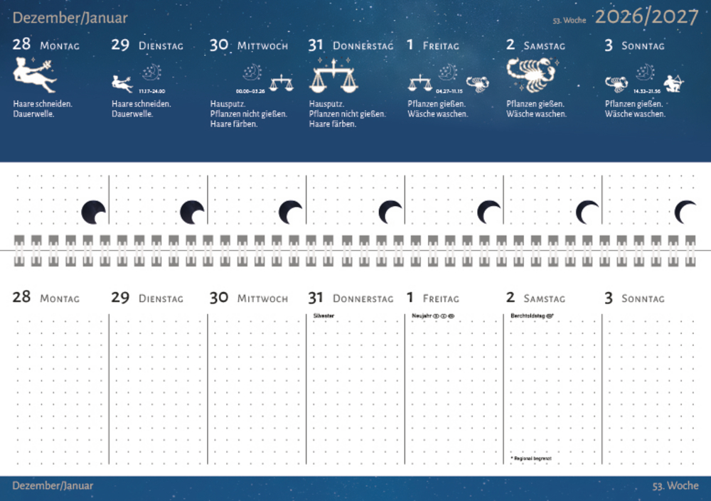 - Jede Woche auf einer Doppelseite mit Platz für Notizen und spontane Ideen; Mit täglichen Tipps und Informationen zu den Mondphasen