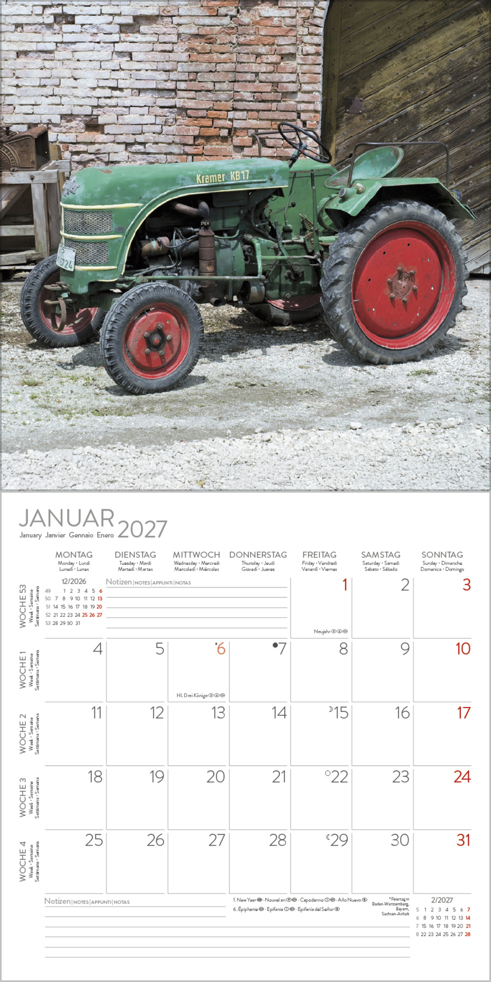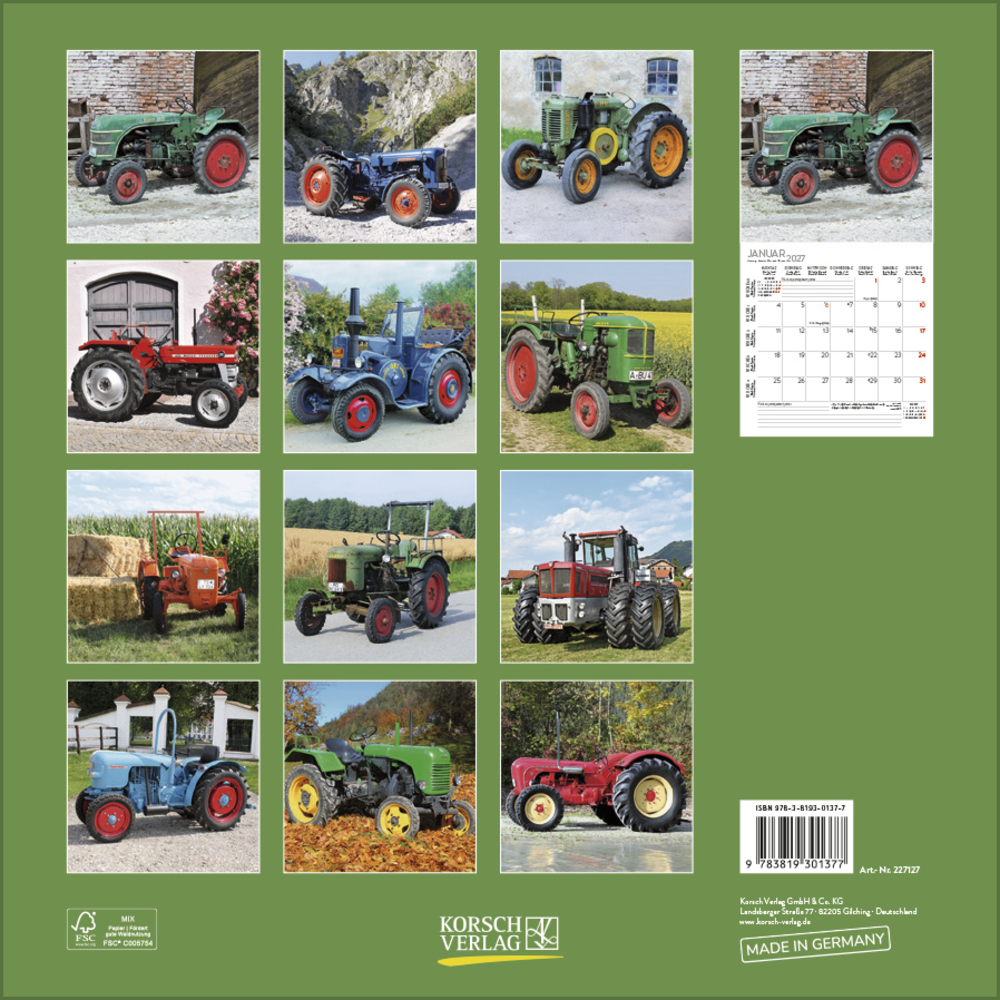 Eine gelungene Auswahl historischer Traktoren ziert diesen praktischen Kalender mit viel Platz für Eintragungen. Das ideale Geschenk für Liebhaber alter Landmaschinen.