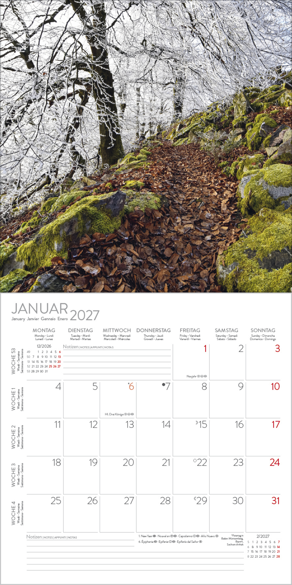 - Jede Kalenderseite mit großem Bild und viel Platz im Kalendarium für Notizen und Termine