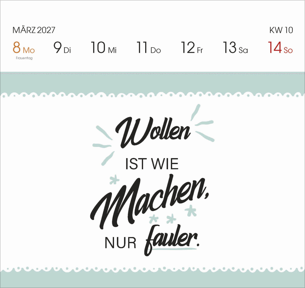 Jedes Kalenderblatt ist so gestaltet, dass es einfach abzutrennen ist. Somit können Sie jede Woche eine Postkarte mit einem schönen Spruch versenden oder verschenken.