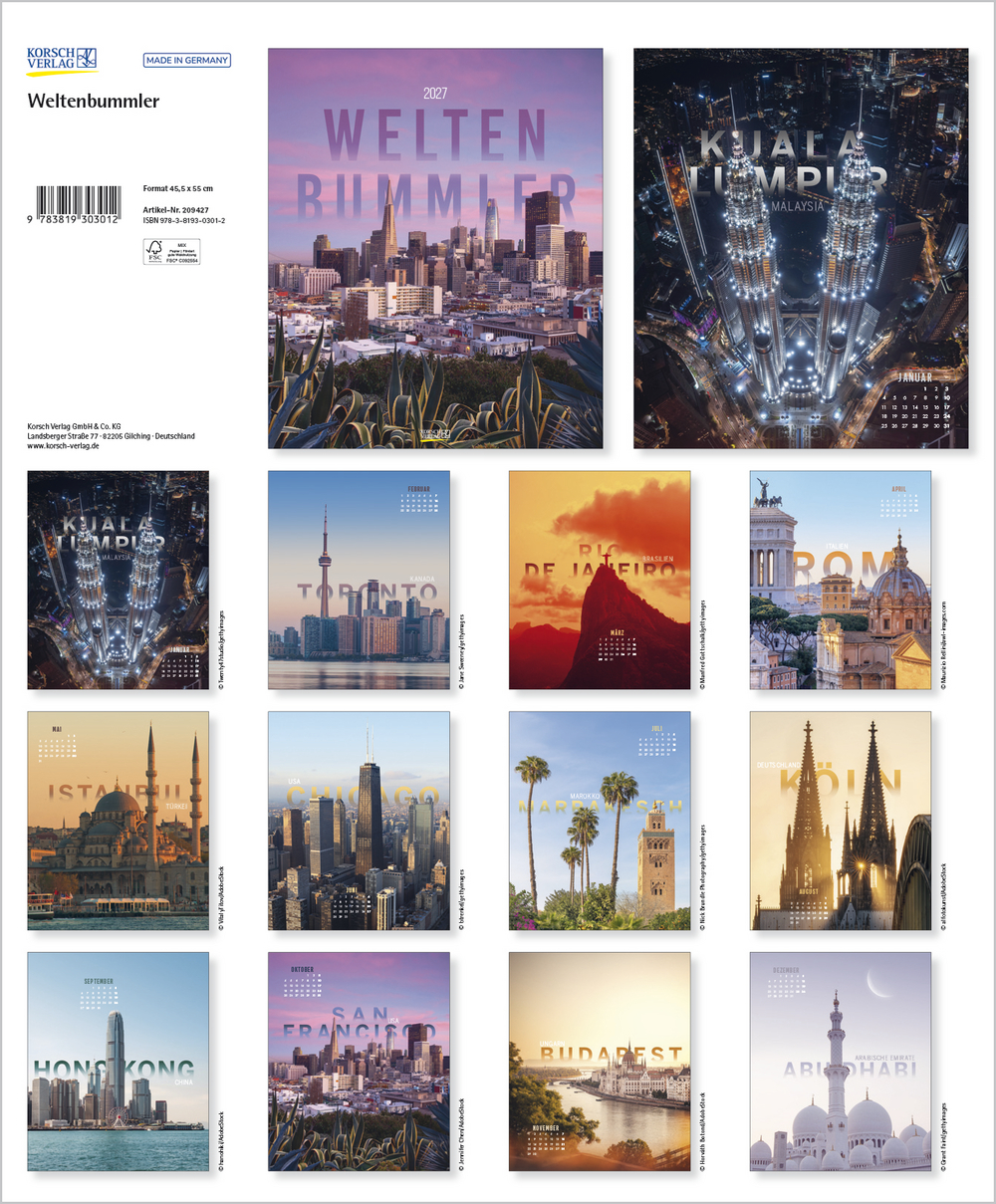 Mit dem Kalender Weltenbummler geht es auf Entdeckungsreise zu den schönsten Städten der Welt im angesagten Poster-Look. Jedes Monatsblatt präsentiert eine andere Stadt, kunstvoll kombiniert mit modern gestalteter Typografie, sodass ein harmonisches Gesamtkunstwerk entsteht. Der perfekte Wandschmuck für alle Reisebegeisterten.