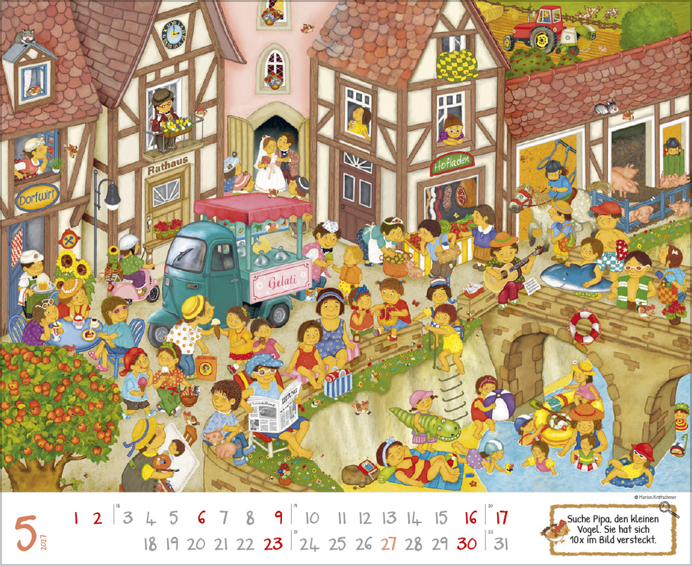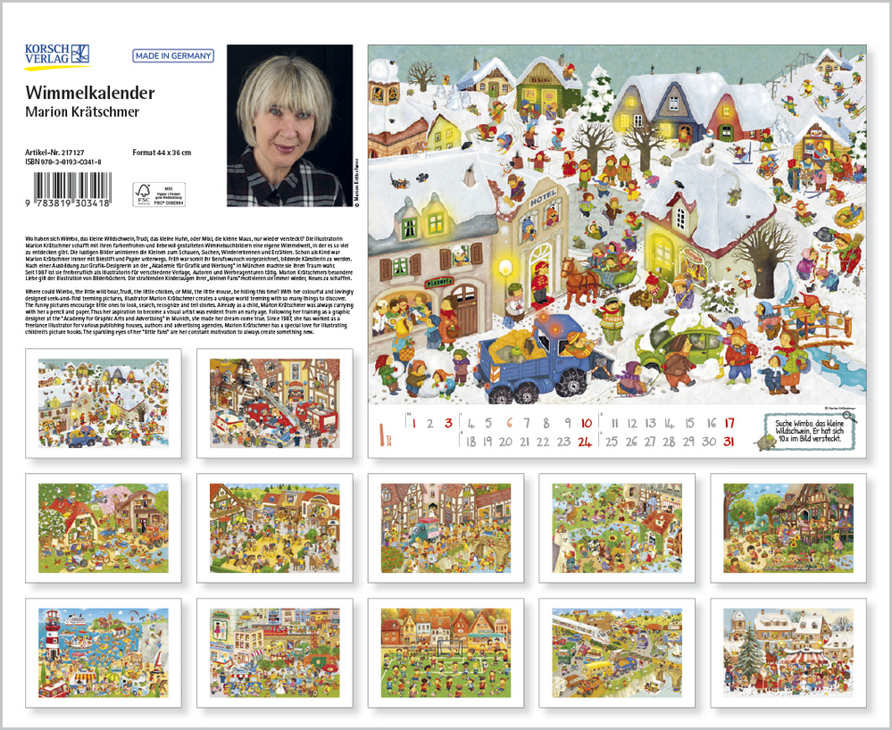 Wo haben sich Wimbo, das kleine Wildschwein, Trudi, das kleine Huhn, oder Mixi, die kleine Maus, nur wieder versteckt? Die Illustratorin Marion Krätschmer schafft mit ihren farbenfrohen und liebevoll gestalteten Wimmelsuchbildern eine eigene Wimmelwelt, in der es so viel zu entdecken gibt. Die lustigen Bilder animieren die Kleinen zum Schauen, Suchen, Wiedererkennen und Erzählen. Eine spannende Entdeckungstour für jedes Kinderzimmer.