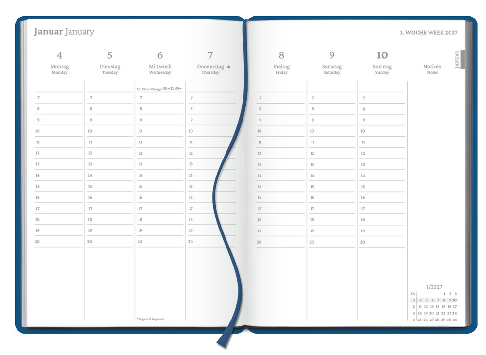- Pro Woche zwei Seiten, vertikales Kalendarium mit Stundeneinteilung