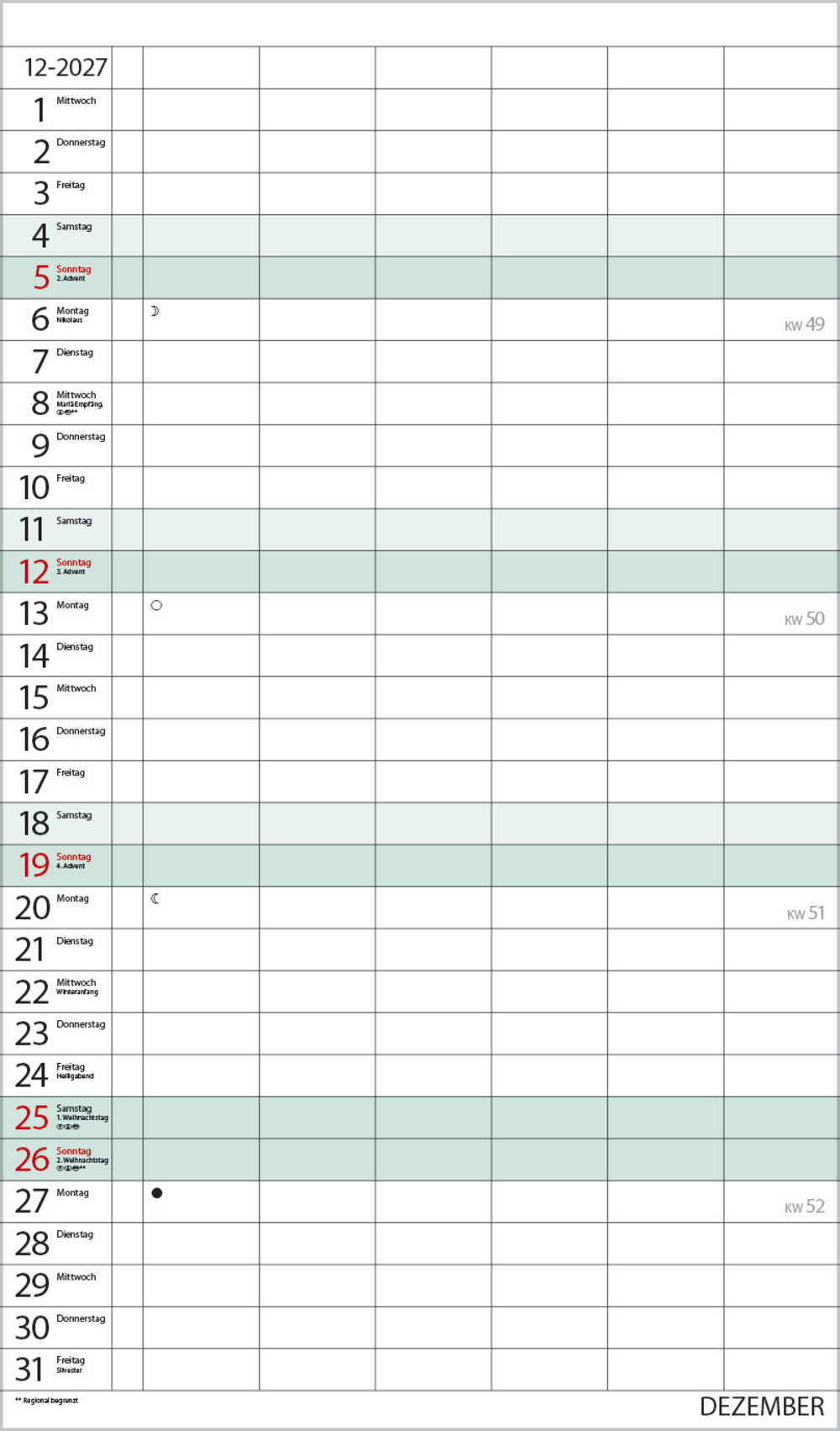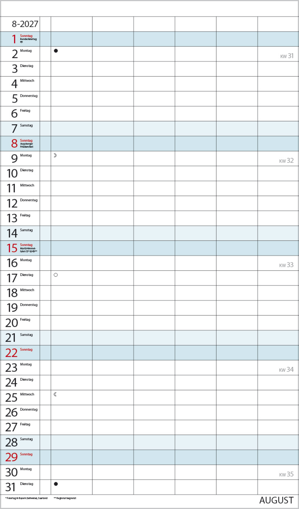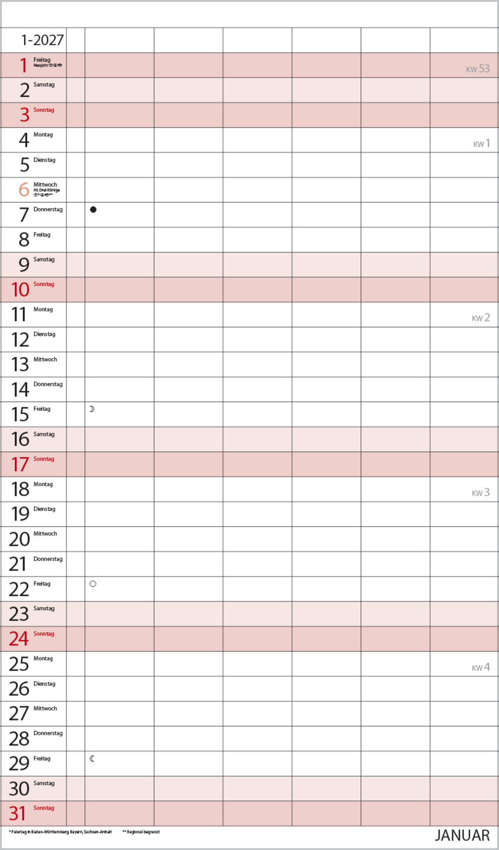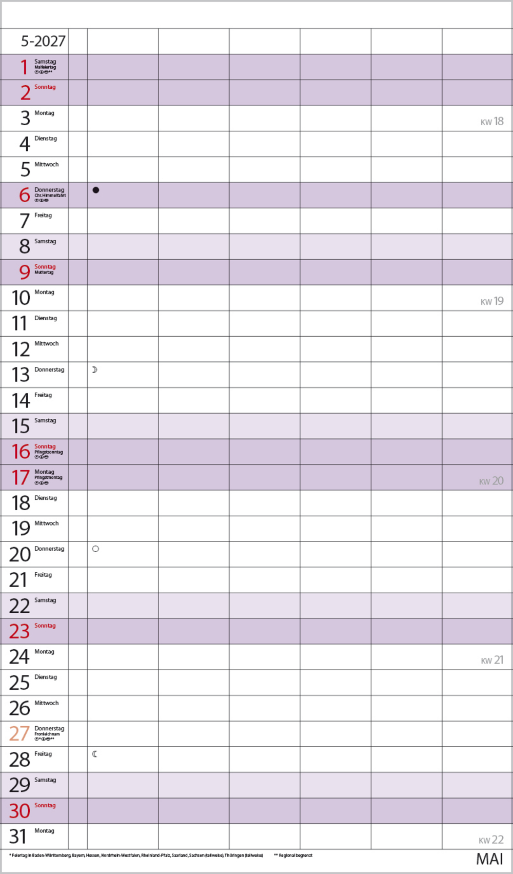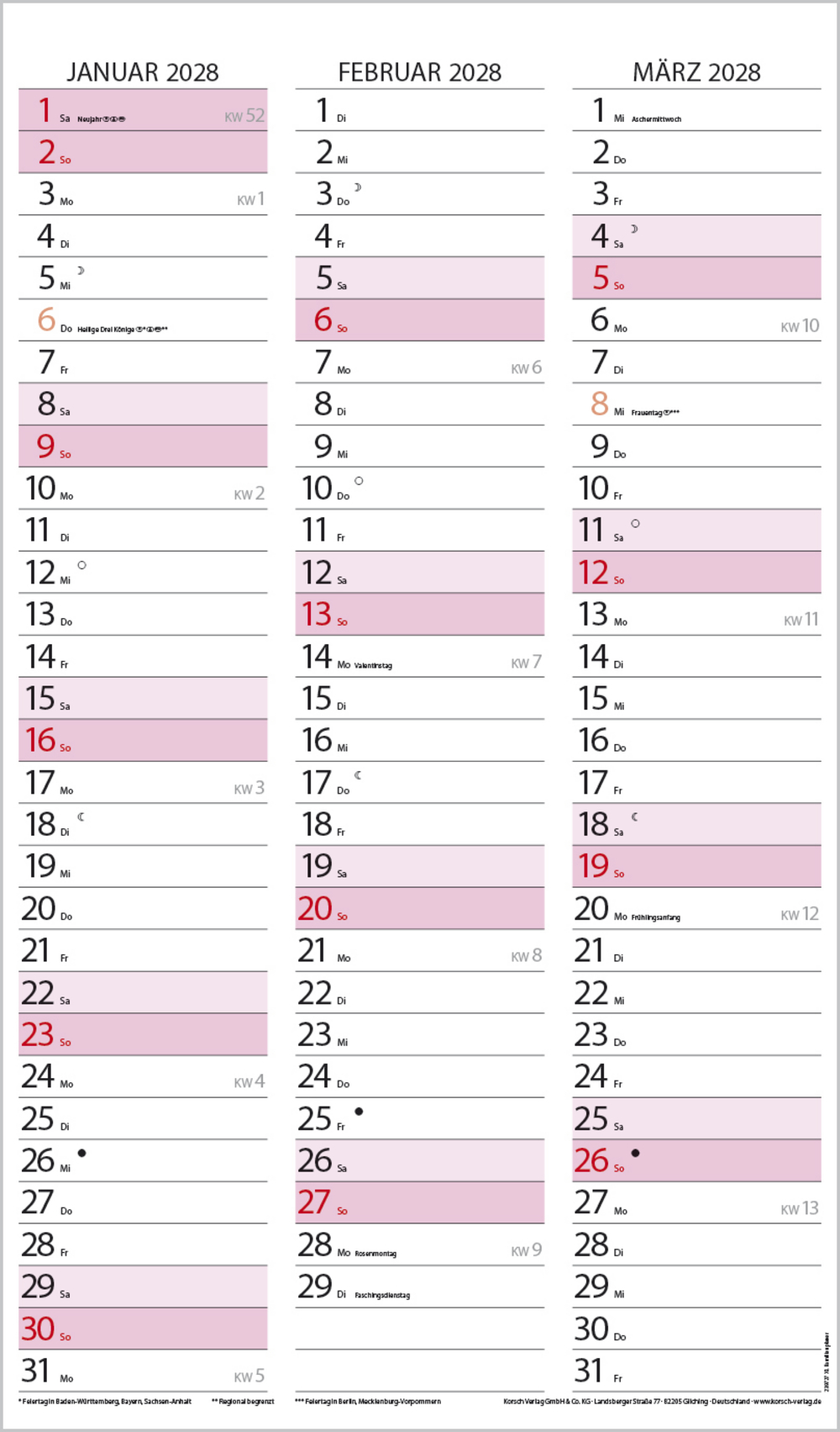 Weitere Informationen wie Mondphasen, Ferientermine und Feiertage (auch regionale) sowie deutlich lesbare Kalenderwochen runden den Kalender ab und sorgen für einen vollständigen Überblick Ihres Jahres.