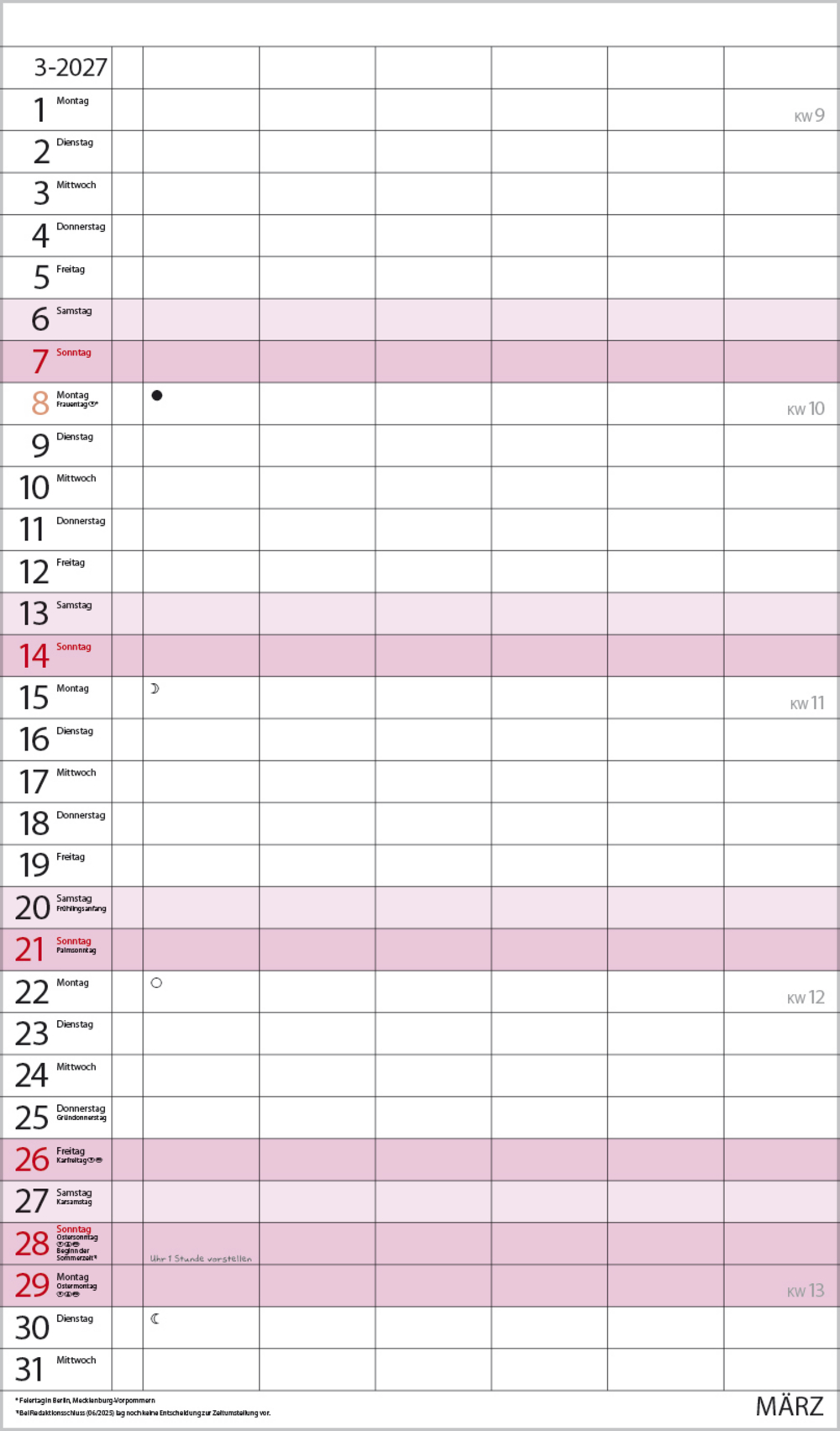 - Farblich hervorgehobene Sonn- und Feiertage, sowie Anzeige der Zeitumstellung