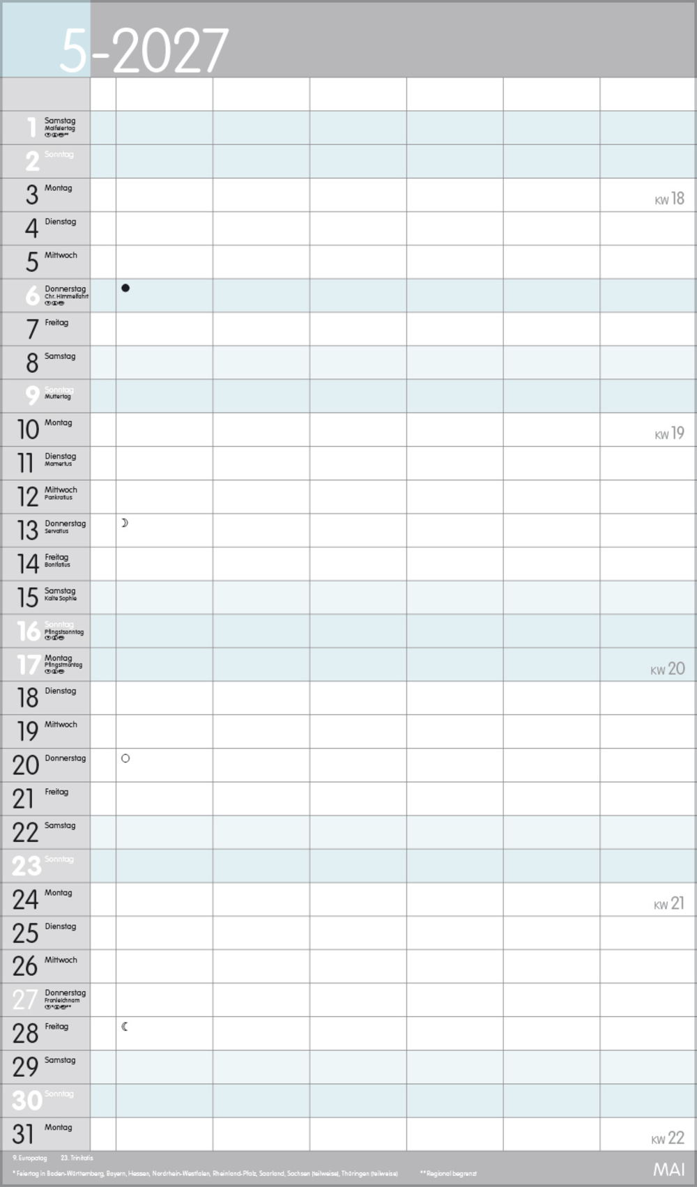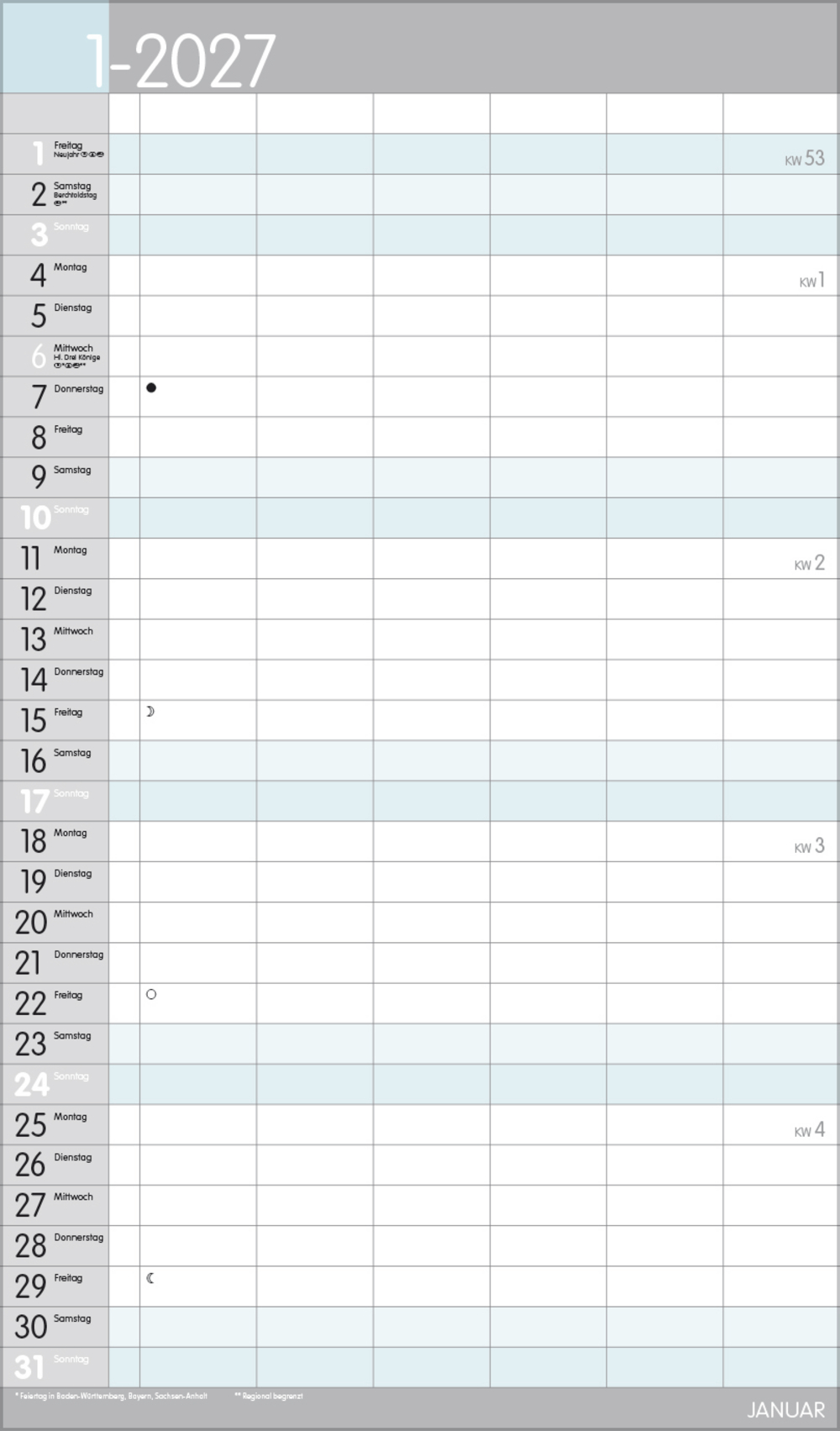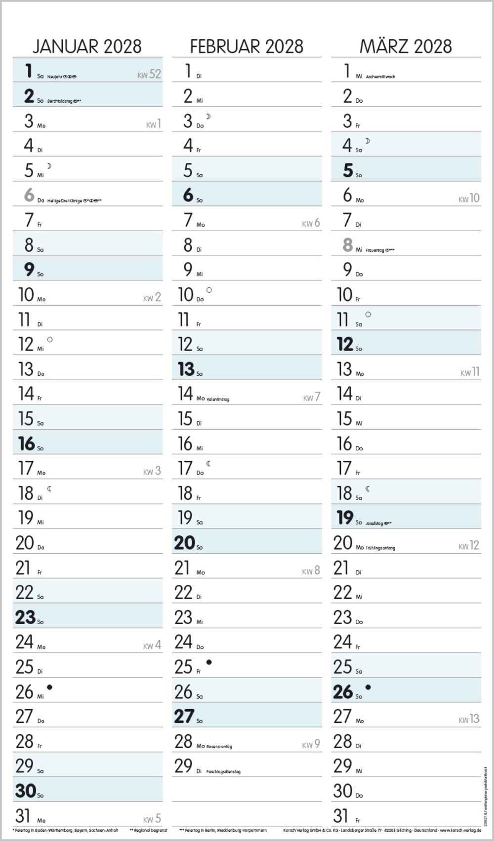 Weitere Informationen wie Mondphasen, Ferientermine und Feiertage (auch regionale) sowie deutlich lesbare Kalenderwochen runden den Kalender ab und sorgen für einen vollständigen Überblick Ihres Jahres.