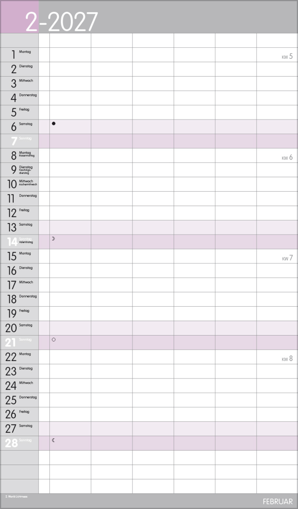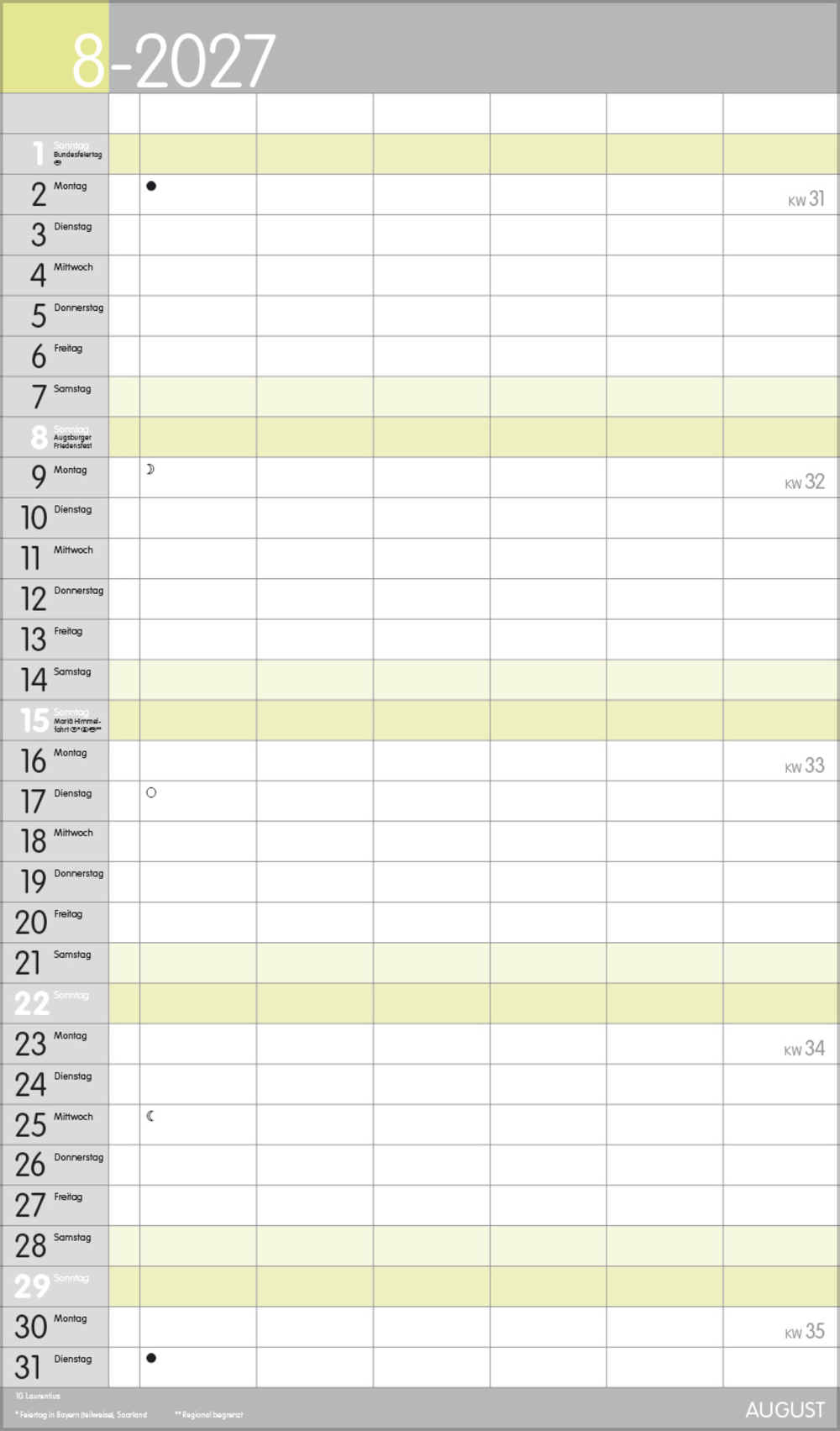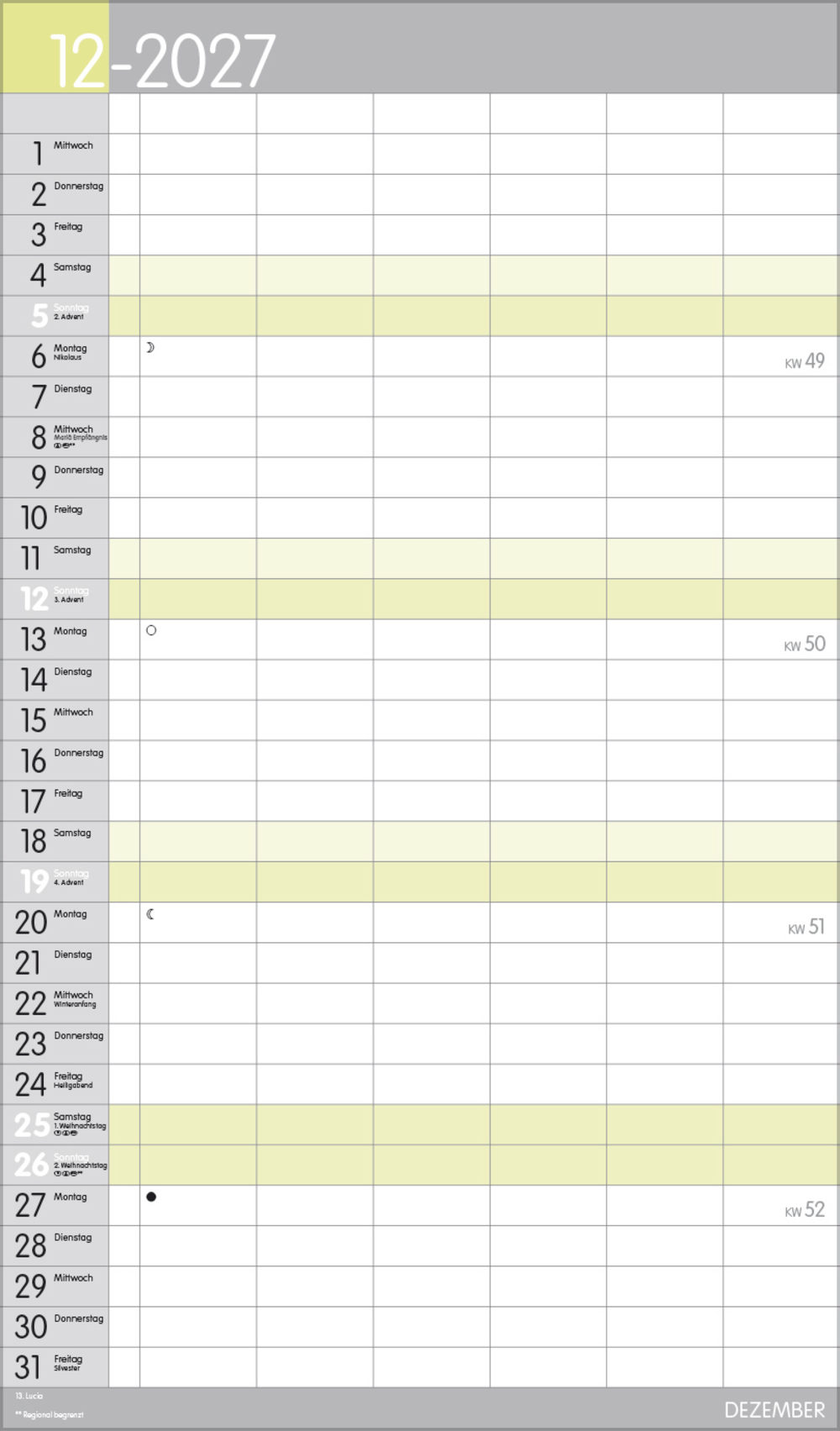 Weitere Informationen wie Mondphasen, Ferientermine und Feiertage (auch regionale) sowie deutlich lesbare Kalenderwochen runden den Kalender ab und sorgen für einen vollständigen Überblick Ihres Jahres.