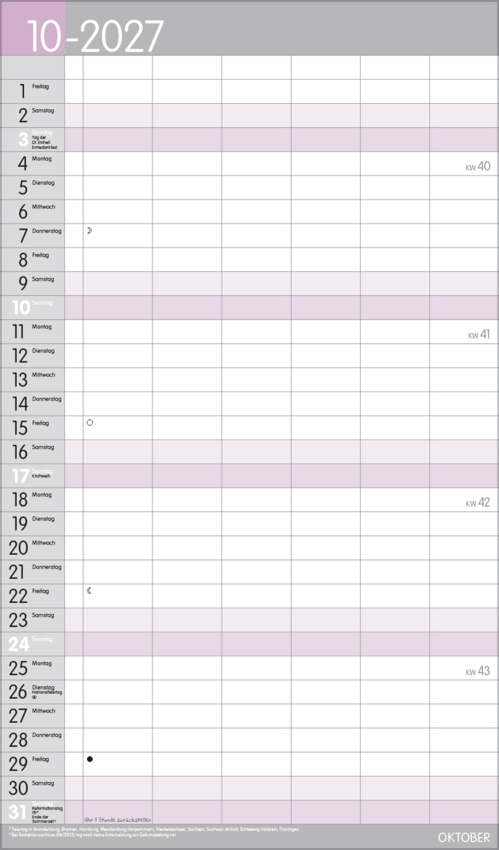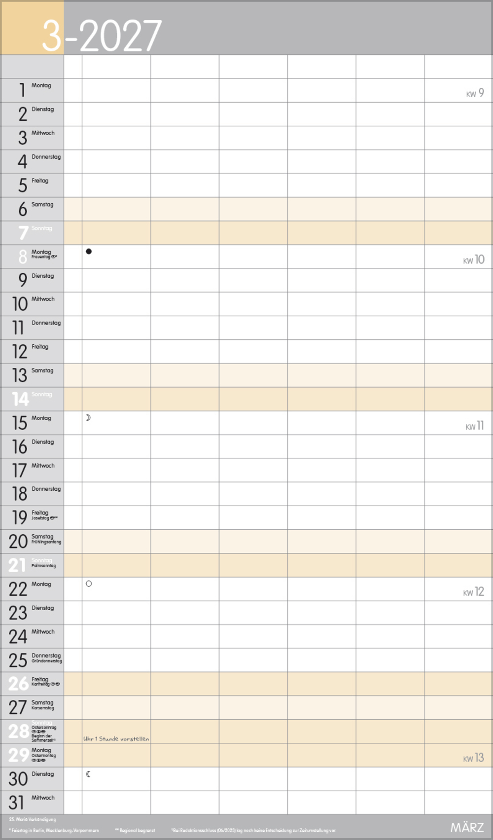 - Farblich hervorgehobene Sonn- und Feiertage, sowie Anzeige der Zeitumstellung
