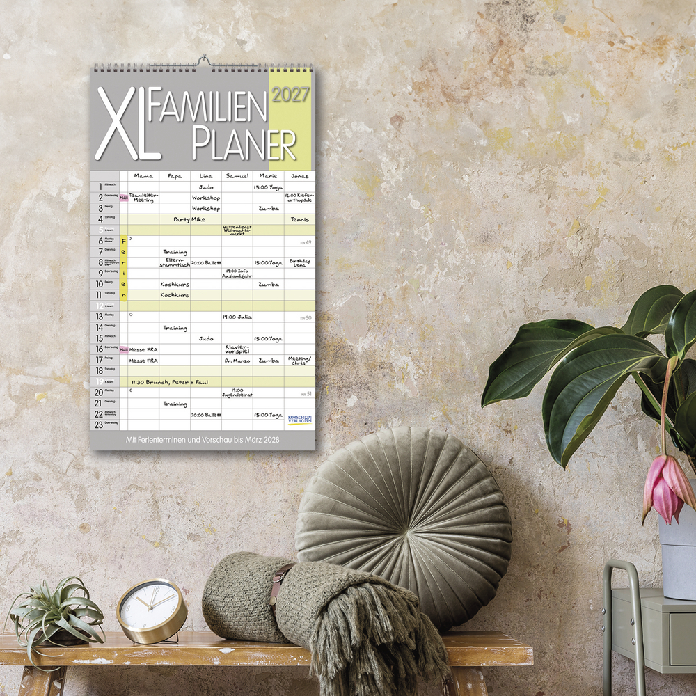 Mit sechs Spalten zum Eintragen von Geburtstagen, Terminen und Erinnerungen bietet der Familienkalender XL viel Platz für Notizen. Damit ist es auch möglich mehrere Termine in einen Tag zu schreiben. Der Organisation des Alltags von großen und kleinen Familien steht somit nix mehr im Weg. Neben dem gesamten Kalenderjahr enthält der Wandplaner auch eine Vorschau bis März des Folgejahres.