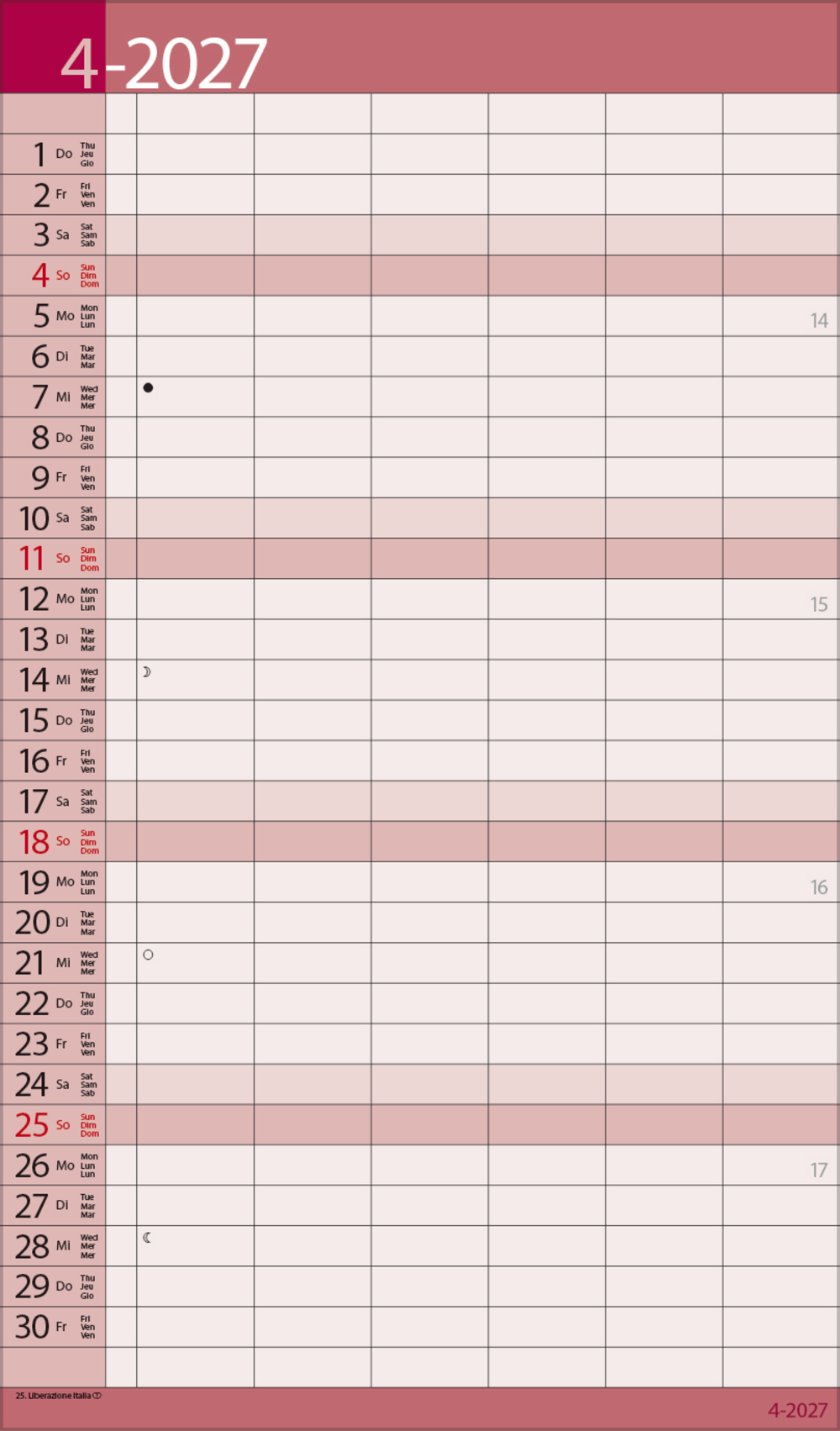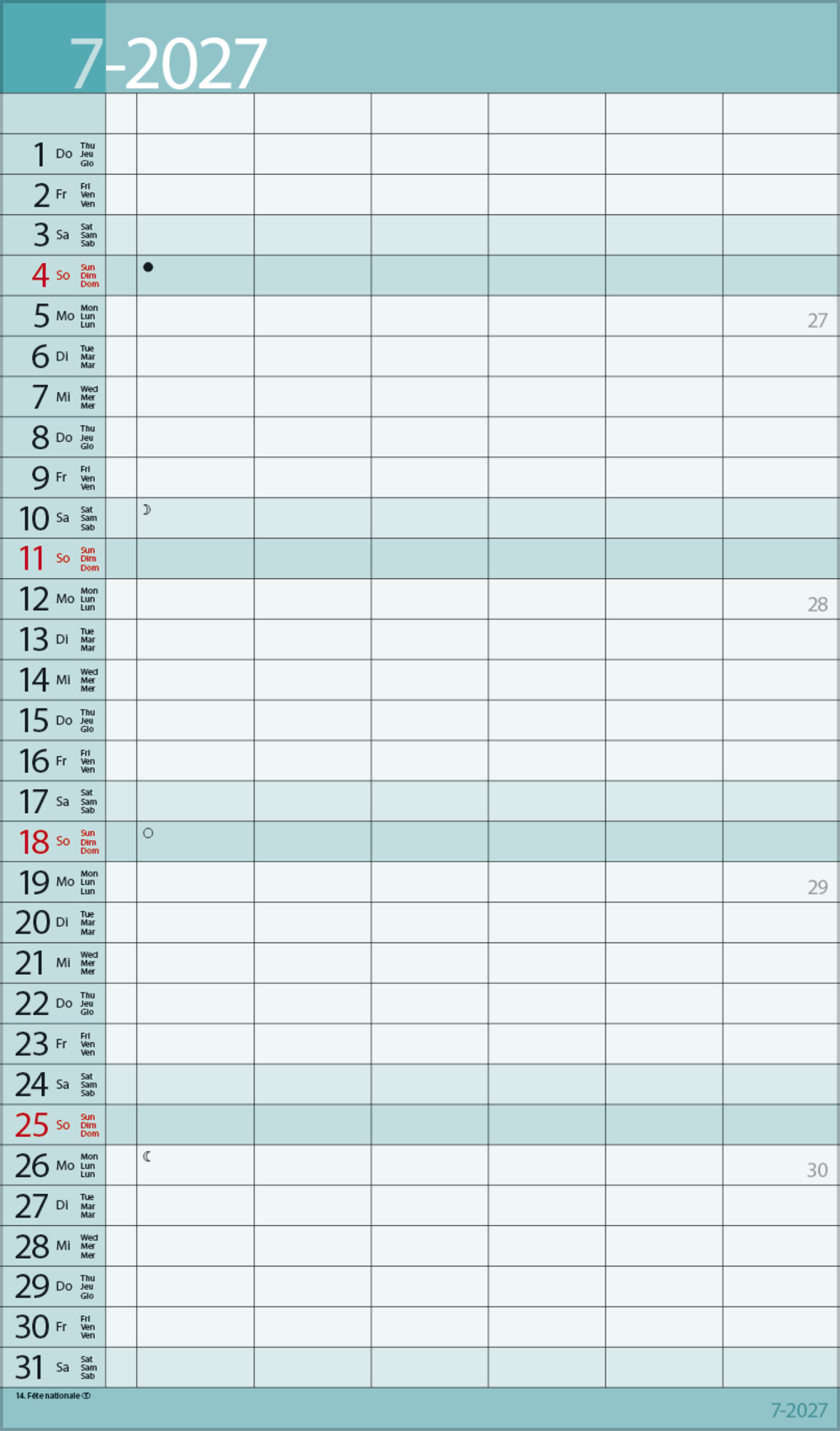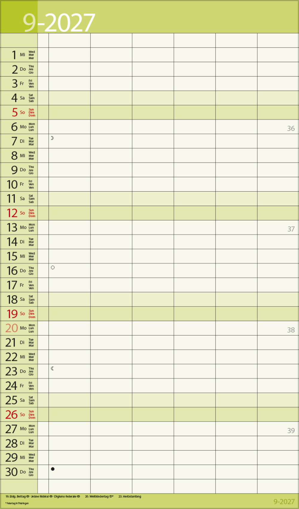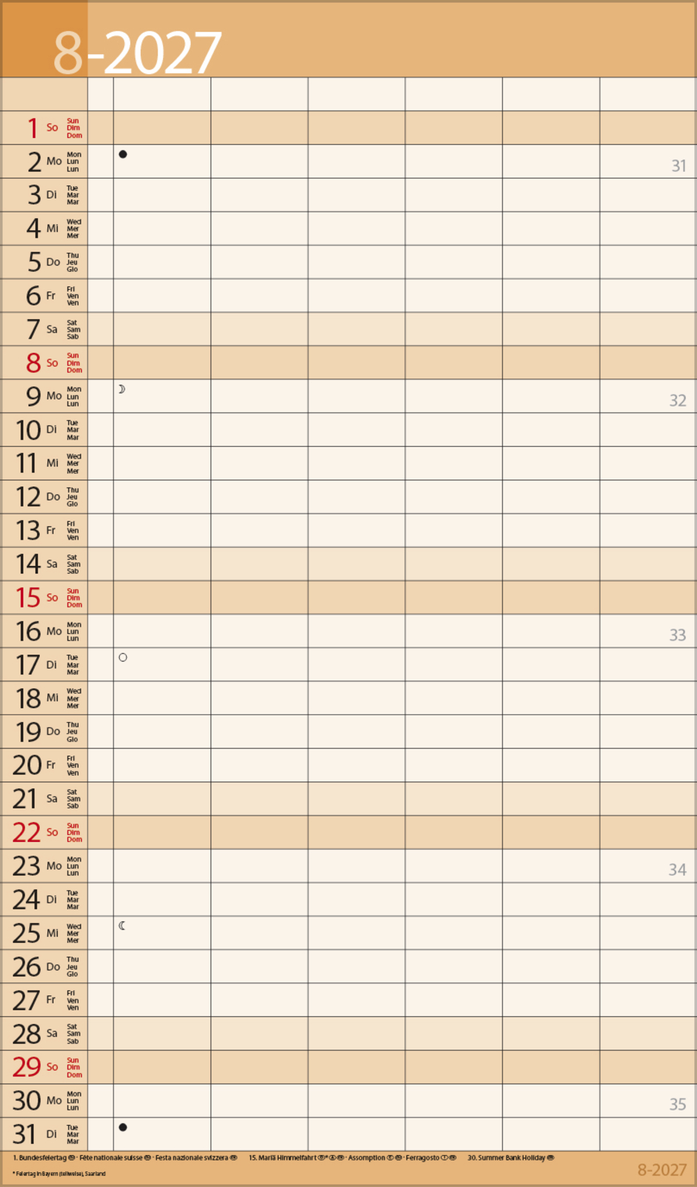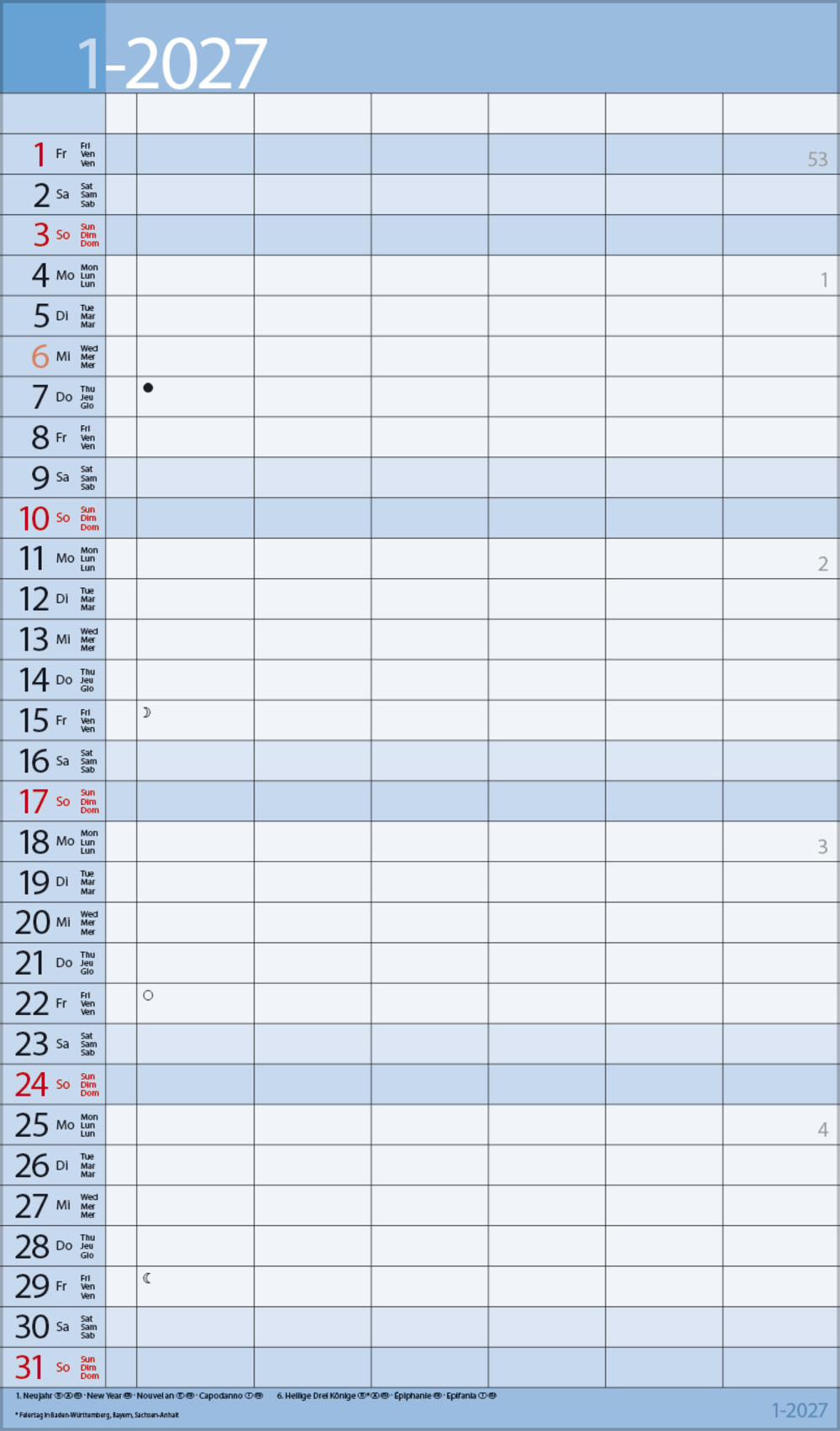 - Mehrsprachiges Kalendarium (d,e,f,i) mit regionalen Feiertagen für Deutschland, Österreich und Schweiz
