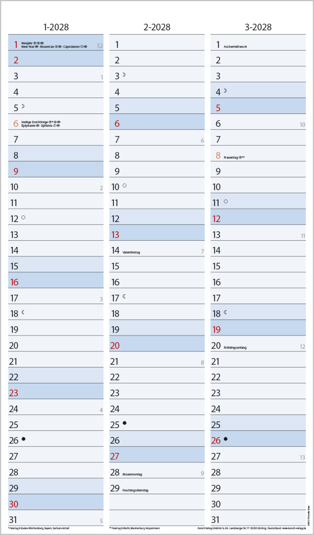 Weitere Informationen wie Mondphasen, Ferientermine und Feiertage (auch regionale) sowie deutlich lesbare Kalenderwochen runden den Kalender ab und sorgen für einen vollständigen Überblick Ihres Jahres.