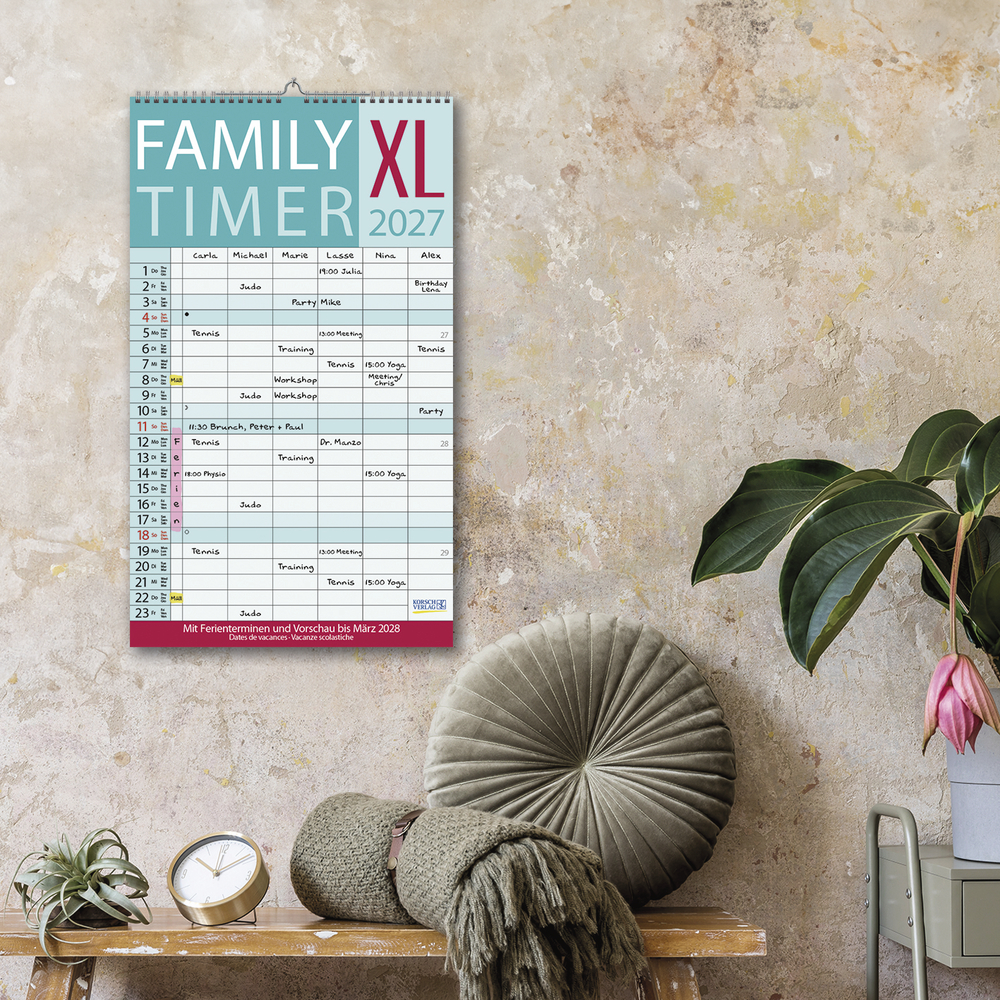 Mit sechs Spalten zum Eintragen von Geburtstagen, Terminen und Erinnerungen bietet der Familienkalender XL viel Platz für Notizen. Damit ist es auch möglich mehrere Termine in einen Tag zu schreiben. Der Organisation des Alltags von großen und kleinen Familien steht somit nix mehr im Weg. Neben dem gesamten Kalenderjahr enthält der Wandplaner auch eine Vorschau bis März des Folgejahres.