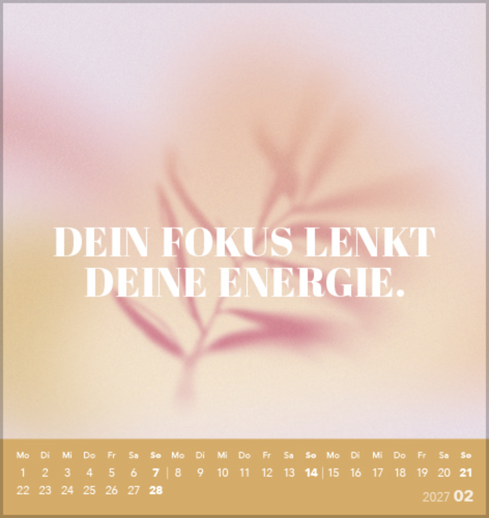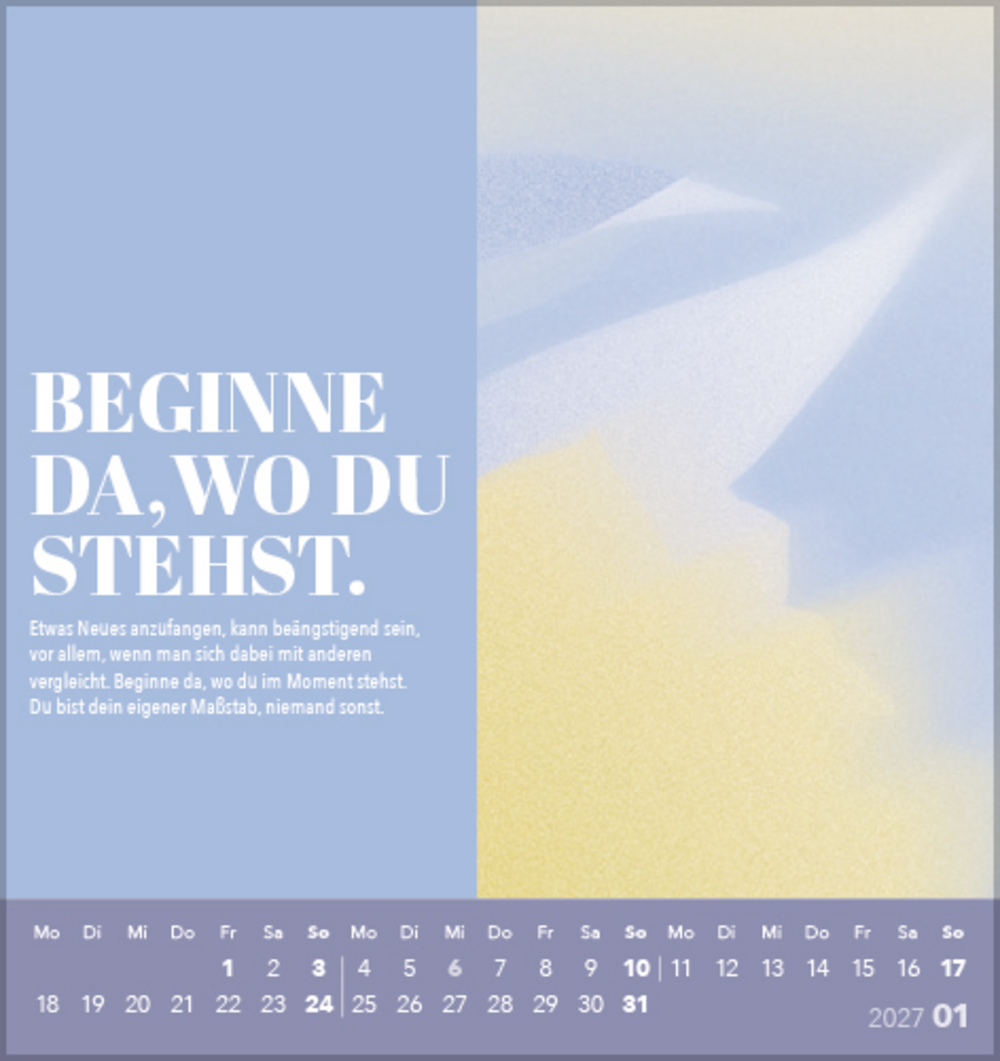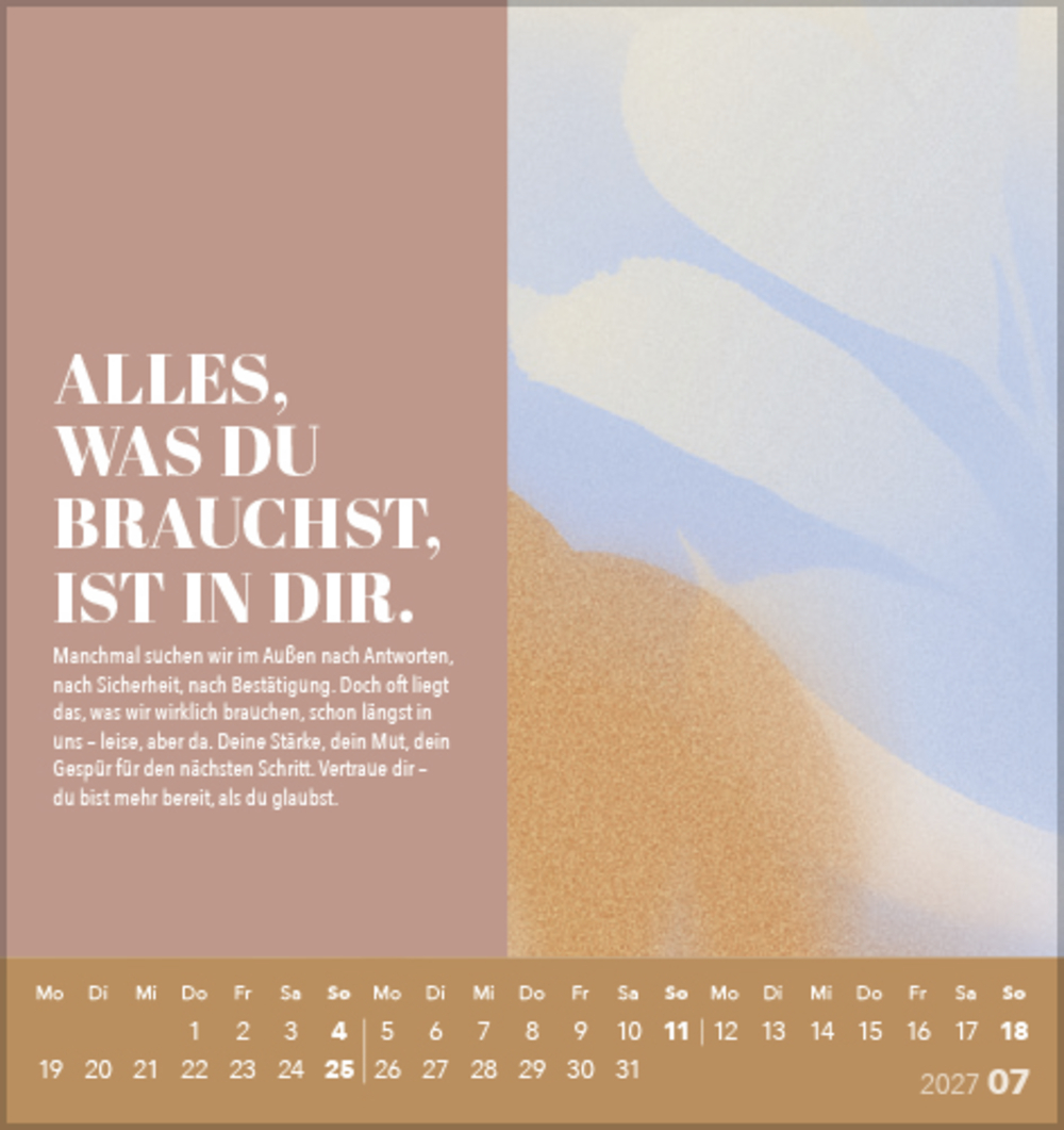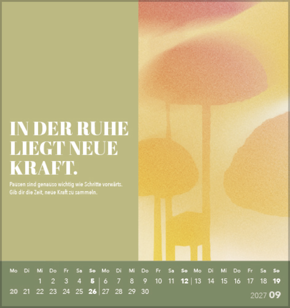 Jedes Kalenderblatt ist so gestaltet, dass es einfach abzutrennen ist. Somit können Sie jeden Monat eine Postkarte mit einem schönen Spruch versenden oder verschenken.